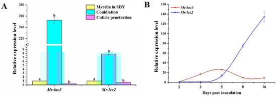 Expression patterns of Mr-lac3 and Mr-lcc2 in M. robertsii. (A). qRT-PCR analysis of Mr-lac3 and Mr-lcc2 expression patterns during mycelia grown in nutrient-rich SDY (Sabouraud dextrose broth plus 1% Yeast Extract), conidiation (5 days post inoculation by spraying 100 µL of 1 × 107 conidia mL−1 conidial suspension onto the PDA plate), and cuticle penetration (appressoria-forming germlings on Galleria mellonella cuticle) in the wild-type strain (WT). The expression level of a gene during conidiation and cuticle penetration was calculated relative to that in mycelia grown in SDY, which was set to 1. Values with different letters are significantly different (p < 0.05). (B). A time course analysis of the expression of Mr-lac3 and Mr-lcc2 during conidiation in the WT strain. RNA was extracted at the 5 conidiation stages, 2, 3, 5, 8, and 16 days post inoculation, by spraying 100 µL of a conidial suspension (1 × 107 conidia mL−1) onto the PDA plate. The expression level at day 2 was set to 1. qRT-PCR analyses were repeated three times.
