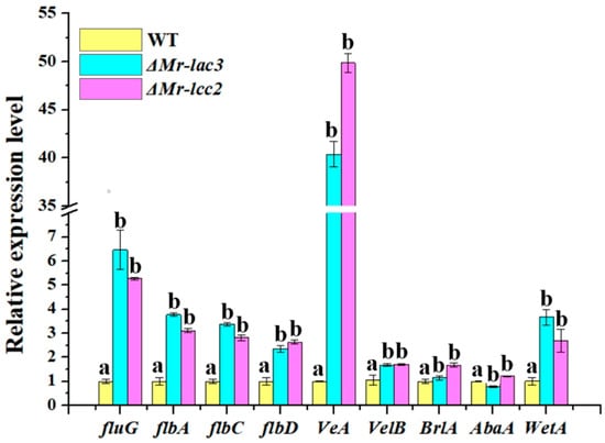 Previous studies have suggested that the formation and development of conidia were controlled by conserved regulatory pathways containing components such as fluG, flbA, flbC, flbD, veA, velB, BrlA, AbaA, and WetA in many filamentous fungi [25]. We conducted qRT-PCR to analyze whether there are regulatory relationships between these components of conidiation regulatory pathways and Mr-lac3 and Mr-lcc2. In comparison to that in the WT strain, the relative expression levels of components in the conidiation regulatory pathways were significantly increased in ΔMr-lac3 and ΔMr-lcc2 (Figure 3). This suggests that Mr-lac3 and Mr-lcc2 may act as negative regulators of conidiation in M. robertsii.