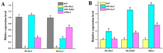In a previous study, a new pigmentation gene cluster was found in M. robertsii, which includes Mr-Pks1, Mr-EthD, and Mlac1. All three genes exercise feedback regulation of conidiation [18]. In this study, qRT-PCR revealed that the expression levels of Mr-lac3 in ΔMr-Pks1 and ΔMlac1 are both significantly decreased compared with that in the WT strain, and those of Mr-lcc2 were also significantly decreased in all three mutants of the pigmentation genes (Figure 4A). Conversely, the expression levels of the three pigmentation genes were all significantly increased in ΔMr-lac3 and ΔMr-lcc2 compared with that in the WT strain (Figure 4B). These findings suggest that Mr-lac3 and Mr-lcc2 are not only related to conidiation, but may also contribute to pigmentation.