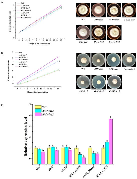 Mr-lac3 and Mr-lcc2 are involved in cell wall integrity. (A). The growth rate of colonies of knock-out (KO) mutants, overexpressed strains, and complementary strains of Mr-lac3 and Mr-lcc2 under abiotic stress treatments with Congo red (1.5 mg/mL). A 5 μL conidial suspension (1 × 107 conidia mL−1) was inoculated in the center of the PDA containing Congo red (1.5 mg/mL) and cultured at 26 °C for a period of time. The diameter of the colonies was measured every day starting from the third day after inoculation. Pictures of the colonies were taken at 10 days post inoculation. (B). The growth rate of colonies of knock-out (KO) mutants, overexpressed strains, and complementary strains of Mr-lac3 and Mr-lcc2 under abiotic stress treatments with guaiacol (0.04%). A 5 μL conidial suspension (1 × 107 conidia mL−1) was inoculated in the center of the PDA with guaiacol (0.04%) and cultured at 26 °C for a period of time. The diameter of the colonies was measured every day starting from 3 days after inoculation. Colony pictures were taken at 10 days post inoculation. Note: * p < 0.05. (C). The expression levels of components involved in cell integrity in ΔMr-lac3 and ΔMr-lcc2. RNA was extracted at 5 days post inoculation. Values with different letters are significantly different (p < 0.05). For each gene, the expression level in WT was set to 1. qRT-PCR analyses were repeated three times with three replicates per repeat.