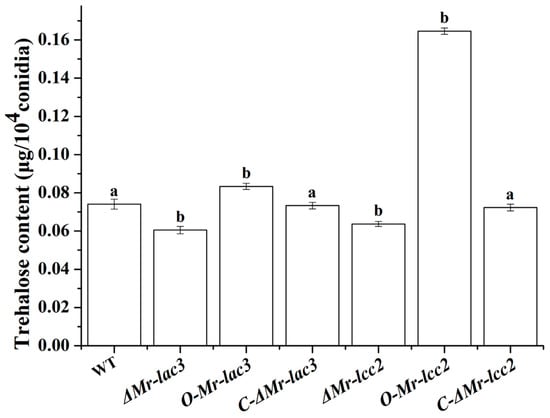 Mr-lac3 and Mr-lcc2 are involved in conidial trehalose synthesis. The 15-day-old conidia (2 × 108 conidia) were washed with ddH2O three times, resuspended in 200 µL ddH2O, and incubated at 100 °C for 20 min. The suspension was then centrifuged for 10 min at 11,000× g, and the supernatant containing trehalose was collected. The amount of glucose liberated by the activity of trehalose was assayed using a glucose (GO) assay kit and converted into trehalose per conidium (measured in triplicate). Each sample without trehalose treatment served as a negative control. Note: There are significant differences between different letters (p < 0.05).