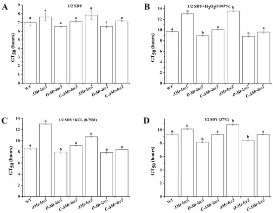 GT50 (time taken for 50% of conidia to germinate) values of knock-out (KO) mutants, overexpressed strains, and complementary strains of Mr-lac3 and Mr-lcc2 under optimal conditions (A) and three abiotic stress treatments [0.005% H2O2 (B), 0.75 M KCl (C), 37 °C (D)]. A 60 μL conidial suspension (4 × 107 conidia mL−1) was inoculated into 3 mL of 1/2 SDY liquid medium and 1/2 SDY liquid medium with 0.005% H2O2 and 0.75 M KCL added in a Petri dish with a diameter of 3 cm. The culture was incubated at 37 °C and 26 °C for a specific period of time. Conidial germination was observed and counted under an inverted microscope every 2 h. Within the same abiotic stress treatment, values with different letters were significantly different (p < 0.05). The assays were repeated three times with three Petri dishes per repeat.