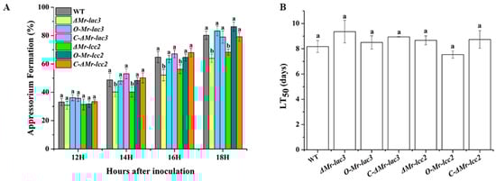Pathogenicity of knock-out (KO) mutants, overexpressed strains, and complementary strains of Mr-lac3 and Mr-lcc2. (A). The percentage of appressoria-forming germlings on a hydrophobic plastic surface. At each time point, values with different letters are significantly different (p < 0.05). Appressorium formation assays were repeated three times with three hydrophobic Petri dishes per repeat. Values with the same letter are not significantly different (p > 0.05). (B). LT50: time needed for 50% of a lethal dose. Pathogenicity assays were repeated three times with 40 insects of Galleria mellonella per repeat.