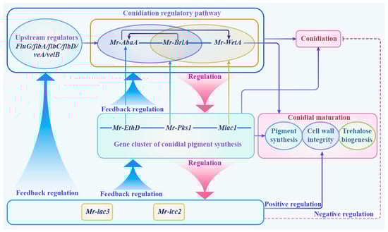 In conclusion, we developed a schematic model illustrating the function and regulation of Mr-lac3 and Mr-lcc2 (Figure 9). Mr-lac3 and Mr-lcc2 were regulated by the conidiation regulatory pathway and the gene cluster of conidial pigment synthesis. In contrast, Mr-lac3 and Mr-lcc2 play a role in feedback regulation in these pathways. The regulatory mechanisms negatively influence conidiation while positively contributing to conidial maturation, which encompasses processes such as pigment synthesis, cell wall integrity, and trehalose biogenesis. Collectively, these processes enhance tolerance to abiotic stresses and contribute to pathogenicity.