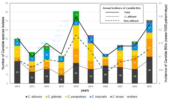 Although Candida albicans has been reported as the most common cause of Candida BSIs, recent studies have shown an increasing proportion of non-albicans Candida BSIs [,,]. While there might be regional epidemiologic differences, some studies have reported an increase in fluconazole-resistant isolates among non-albicans Candida species from BSIs, particularly C. auris, C. glabrata (Nakaseomyces glabratus), and C. parapsilosis [,,]. In Korea, the proportion of non-albicans Candida BSIs has exceeded that of C. albicans since 2006 []. The selection of appropriate antifungal agents for Candida BSIs necessitates epidemiologic data on the distribution of Candida species and their antifungal resistance profiles. Therefore, ongoing surveillance data on the distribution of Candida species from BSIs and antifungal susceptibility are important not only at the national level, but also at the institutional level. This study aimed to analyze clinical features, epidemiological characteristics, and antifungal susceptibility patterns of Candida BSIs at our hospital from 2014 to 2023. Risk factors for 30-day mortality were also examined.