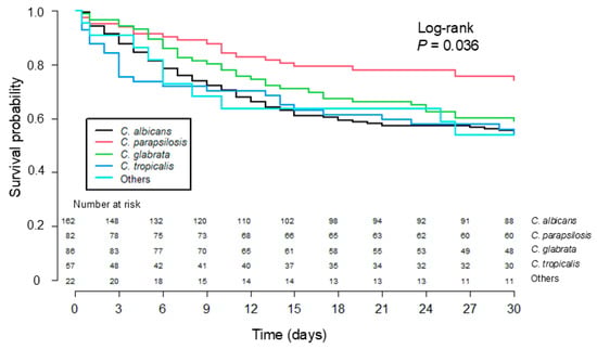 Kaplan–Meier survival curve showing 30-day mortality of patients with Candida bloodstream infections caused by different Candida species.