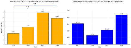 Yearly proportion of Trichophyton tonsurans among all confirmed fungal infections (2019–2022), stratified by age group (adults and children). ** p-value < 0.001.