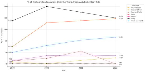During the study period, from 2019 to 2022, the annual incidence of T. tonsurans increased significantly among adults, rising from 4.8% (n = 22/454) in 2019 to 11.5% (n = 45/390) in 2022 (p < 0.001), as shown in Figure 1. Although a general increase in T. tonsurans infections was observed from 2019 to 2022, a slight decrease occurred in 2022 compared to 2021 (from 12.7% to 11.5%), which was not statistically significant (p =0.64). Among children, the incidence increased non-significantly from 30.8% (n = 4/13) in 2019 to 40.3% (n = 10/23) in 2022 (p =0.5), as shown in Figure 1. When trends were analyzed based on the site of infection (Figure 2), a consistently high percentage of T. tonsurans isolates was observed in the upper-body regions, including the scalp, head and neck, trunk, and upper limbs, compared to a low percentage of isolates from the lower body regions, including the crural region, legs, feet, and nails. A statistically significant increase in head and neck T. tonsurans infections among adults was observed, from 30.0% in 2019 (n = 3/10) to 78.6% in 2022 (n = 10/14) (p < 0.05). Additionally, among adults, there was a non-significant increase in T. tonsurans upper-body tinea corporis (involving the trunk and upper limbs, excluding the palms) from 20.0% in 2019 (n = 4/20) to 46.4% in 2022 (n = 16/28) (p = 0.11), making it the leading causative pathogen in 2022. Interestingly, over the entire study period, T. tonsurans was a significantly more frequent cause of upper-body tinea corporis than lower-body tinea corporis (38.9% [n = 42/108] vs. 10.7% [n = 8/75], respectively; p-value < 0.001).