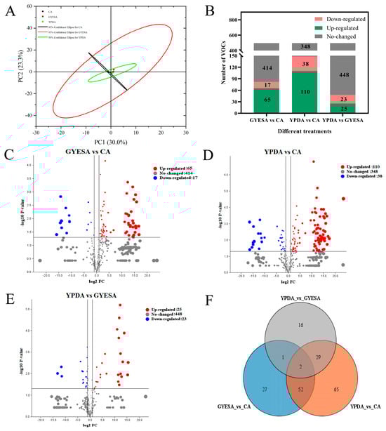 Analysis of total VOCs produced by CEF642N across different media. (A) PCA score plot of VOCs. (B) Number of up-regulated, down-regulated, and non-significant VOCs in each comparison group. (C–E) Volcano plots of VOCs in GYESA_vs_CA, YPDA_vs_CA, and YPDA_vs_GYESA groups. (F) Venn diagram of differential VOCs across comparison groups.
