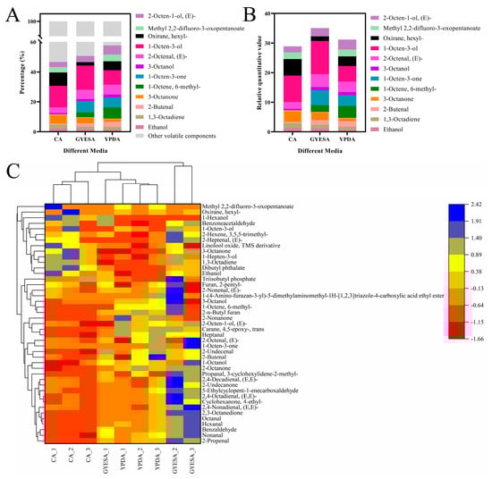 A total of 12 annotatable VOCs with relative quantitation values > 1 were identified (Table S2), including ethanol, 1,3-octadiene, 2-butenal, 3-octanone, 1-octen, 6-methyl-, 1-octen-3-one, 3-octanol, 2-octenal, (E)-, 1-octen-3-ol, oxirane, hexyl-, 2-octen-1-ol, (E)-, and methyl 2,2-difluro-3-oxopentanoate. The top three VOCs by percentage and relative quantitation value in each medium was as follows (Figure 3A,B): YPDA medium was 1-octen-3-ol (9.79%; 5.30), 1-octen, 6-methyl- (7.49%; 4.05), and 1-octen-3-one (6.69%; 3.62); GYESA medium was 1-octen-3-ol (16.18%; 11.23), 1-octen-3-one (7.38%; 5.12), and 2-octenal, (E)- (6.26%; 4.34); and CA medium was 1-octen-3-ol (14.41%; 8.93), oxirane, hexyl- (9.02%; 5.59), and 3-octanone (6.28%; 3.89). Clustered heatmap analysis revealed significant differences in the major VOCs among different media (Figure 3C).