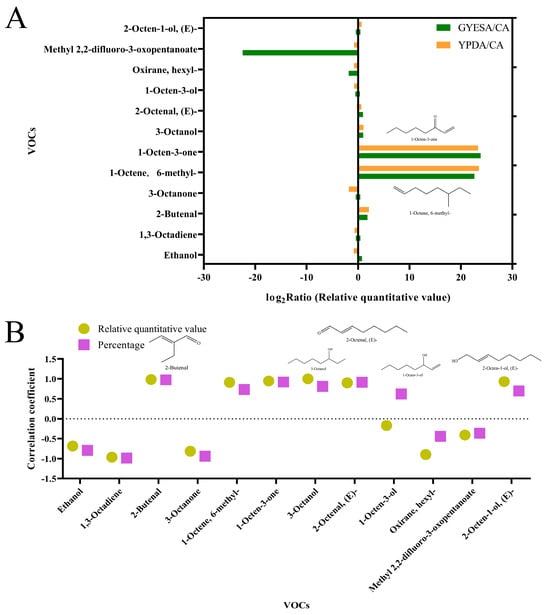 Comparative analysis of primary VOCs and their correlation with inhibition rates. (A) Log2-transformed ratios of primary VOCs relative quantitation values in GYESA and YPDA media compared to CA medium. (B) Correlation analysis of relative quantitative values and percentages of major VOCs with inhibition rate.