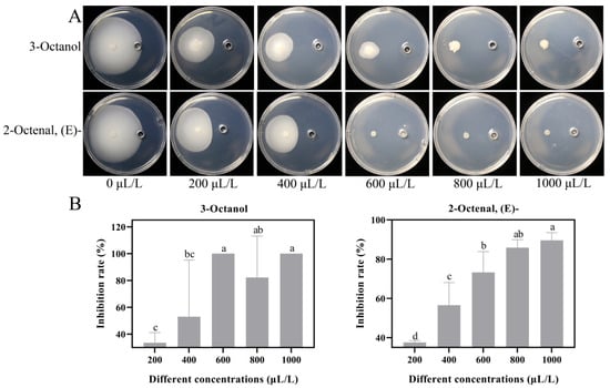 Inhibition of Vd076 by 3-octanol and 2-octen-1-ol, (E)-. (A) Photographs of Vd076 treated with varying concentrations of 3-octanol and 2-octen-1-ol, (E)- at day 15. (B) Inhibition rates of Vd076 at day 15.