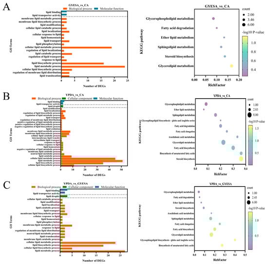 GO and KEGG enrichment analysis of fatty acid metabolism-related genes in CEF642N. (A–C) Enrichment analysis for GYESA_vs_CA, YPDA_vs_CA, and YPDA_vs_GYESA groups.