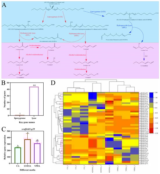 Eight-carbon volatiles, which contribute to the distinct scent of many fungi, are oxylipin molecules involved in various biological processes. These compounds are produced through the oxidation and cleavage of linoleic acid [,]. Lipoxygenase (LOX) and lipid hydroperoxide lyase (HPL) are the two most important enzymes [,] in its biosynthesis (Figure 7A). A genomic search for LOX in the CEF642N genome identified only one gene, scaffold1.g29, and no HPL-related genes were detected. However, 44 genes associated with lyase enzymes were identified (Figure 7B). Among the three different media, the LOX gene scaffold1.g29 exhibited the highest expression in the GYESA medium, followed by the YPDA medium (Figure 7C). Lyase enzyme genes, including scaffold2.g848, scaffold3.g19, scaffold4.g715, scaffold10.g134, scaffold5.g321, scaffold5.g359, scaffold5.g426, scaffold3.g748, scaffold10.g153, scaffold2.g16, scaffold4.g88, scaffold9.g305, scaffold9.g306, scaffold5.g776, scaffold6.g279, and scaffold8.g576, showed higher expression in the YPDA medium compared to the CA medium (Figure 7D).