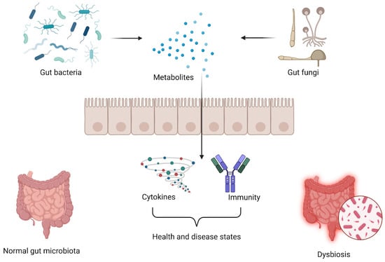 A balanced microbial environment and dysbiosis influence the interactions between bacteria and fungi within the gut microbiota. Under normal conditions, these microorganisms engage in cooperative relationships that support gut health. However, in dysbiosis, their interactions can become antagonistic, potentially disrupting immune regulation and contributing to disease development and progression. Created with Biorender.com (accessed on 16 February 2025).