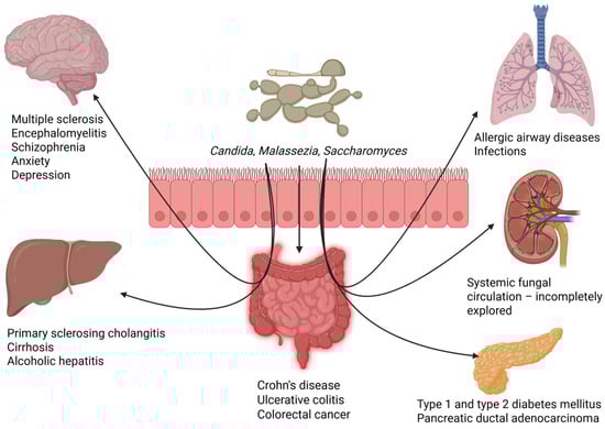 The gut mycobiome plays a significant role in liver disease through the gut–liver axis. Studies have shown that patients with primary sclerosing cholangitis, cirrhosis, and alcoholic hepatitis exhibit increased mycobiome diversity, suggesting a link between fungal dysbiosis and liver pathology [159,160,161]. Conversely, kefir has been identified as a potential therapeutic agent for alcoholic fatty liver disease by modulating the gut mycobiome [162]. These findings highlight the therapeutic potential of targeting the gut–liver axis in liver disease management [163]. Similarly, the gut–kidney axis has been implicated in fungal infections. Research in mice with Candida-disseminated infections has shown that the kidneys carry the highest fungal burden, emphasizing their role in systemic fungal circulation. However, the exact contribution of gut mycobiome imbalance to renal disease pathogenesis remains largely unexplored [164]. The interplay between the gut mycobiome and the pancreas has also been observed in metabolic and oncological conditions. Patients with type 1 and type 2 diabetes mellitus exhibit elevated C. albicans levels, suggesting a potential role of fungal dysbiosis in diabetes development [165]. Additionally, increased Malassezia spp. levels have been found in patients with pancreatic ductal adenocarcinoma, indicating a possible gut–pancreas connection via the sphincter of Oddi [14,166]. However, further research is needed to determine whether gut mycobiome dysbiosis is a driving factor in oncogenic progression or a consequence of the disease. Understanding these gut–organ axes may open new avenues for targeted fungal-based therapies in various diseases [163]. The relationship between the gut mycobiome and the main affected organs is illustrated in Figure 3.