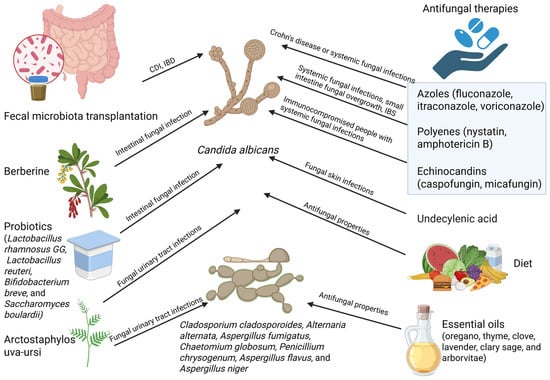 Polyenes, which bind to ergosterol and damage fungal cell membranes, are another class of antifungal agents. Examples of these include nystatin and amphotericin B [191,192]. Amphotericin B is used for severe systemic fungal infections but rarely for gut dysbiosis [125]. Nystatin is a non-absorbable antifungal utilized for gastrointestinal Candida overgrowth [193]. Nystatin has been used to treat small intestine fungal overgrowth (SIFO) and IBS to alleviate symptoms in patients suffering from fungal dysbiosis [194]. Conversely, polyenes may induce local irritation and be harsh on the intestinal lining [195,196]. Echinocandins (caspofungin and micafungin) target β-glucans to inhibit the formation of fungal cell walls [197]. They may help immunocompromised people with gut fungal overgrowth and are used for systemic fungal infections but not frequently for gut dysbiosis [198,199]. A study by Puškárová et al. investigating the antibacterial and antifungal properties of six essential oils (oregano, thyme, clove, lavender, clary sage, and arborvitae) found that they effectively inhibit mycelial growth. Their antifungal effects, whether fungicidal or fungistatic, varied depending on the fungal strain (Cladosporium cladosporoides, Alternaria alternata, Aspergillus fumigatus, Chaetomium globosum, and Penicillium chrysogenum). Additionally, the study revealed that the vapor administration of these essential oils was more effective than liquid application [200]. Research indicates that berberine possesses significant antifungal activity, notably against C. albicans. In murine models, berberine administration has been shown to reduce intestinal damage associated with fungal overgrowth and improve the balance of gut microbiota, thereby preventing dysbiosis [201]. An in vitro study conducted by Tonoue et al. examined the antimicrobial effects of Arctostaphylos uva-ursi (A. uva-ursi), a plant commonly used for urinary tract infections, on Aspergillus flavus, Aspergillus fumigatus, Aspergillus niger, C. albicans, and Escherichia coli. The results revealed that A. uva-ursi exhibited antimicrobial activity only against C. albicans and E. coli, with a stronger effect observed when using the herbal extract than the homeopathic mother tincture. However, the authors noted that their findings were inconclusive due to study limitations, including the absence of comparable research, the lack of isolation of the plant’s active ingredients, and variability in the extracts’ sources [202]. Additionally, a review by Gupta et al. emphasized the significant antibiotic properties of A. uva-ursi in treating urinary tract infections, primarily attributed to its glycoside arbutin, which is converted into hydroquinone. The authors highlighted arbutin’s multiple potential effects, including antiseptic, antibiotic, astringent, and diuretic properties, while calling for further research to better understand its therapeutic potential [203]. A study by Shi et al. investigated the effects of undecylenic acid on C. albicans skin infections and found that it serves as an effective antifungal agent. The study demonstrated that undecylenic acid inhibits C. albicans biofilm formation and prevents its transition from yeast to filamentous form, even at low treatment doses [204].