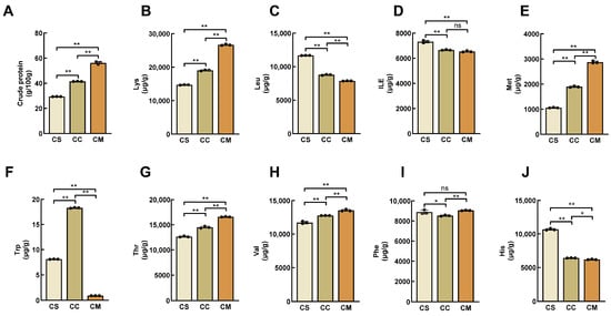 Determination of essential amino acid content. (A) Crude protein content; (B) Lysine content; (C) Leucine content; (D) Isoleucine content; (E) Methionine content; (F) Tryptophan content; (G) Threonine content; (H) Valine content; (I) Phenylalanine content; (J) Histidine content. “*” indicates a significant difference (p < 0.05); “**” indicates an extremely significant difference (p < 0.01); “ns” indicates the difference is not significant (p > 0.05).