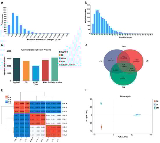 We conducted a proteomic analysis of the proteins identified in CS, CC, and CM. Results demonstrated that a higher number of proteins were detected within the lower molecular weight range of 21–41 kDa, with a gradual decrease in protein abundance as molecular weight increased (Figure 2A). Subsequently, we observed that peptides typically ranged from 8 to 21 amino acids in length, and the number of peptides initially increased and then decreased with increasing length (Figure 2B), suggesting high detection efficiency and sensitivity in mass spectrometry analysis and confirming the reliability of the proteomics data. Therefore, a total of 26,081 peptide segments were identified, corresponding to 3116 unique proteins, and were subjected to a comparative analysis against several databases, including GO, KEGG, EggNOG, Pfam, and subcellular localization databases. The results revealed that the highest number of proteins were annotated by EggNOG, followed by SubCell-Location. In contrast, the number of proteins annotated by KEGG was relatively lower (Figure 2C).