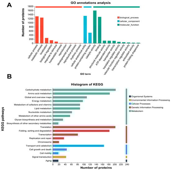 Analysis of GO and KEGG annotations for proteins. (A) GO annotations for proteins. The x-axis of the figure represents specific GO terms, while the y-axis indicates the corresponding number of proteins; (B) KEGG annotations for proteins. The x-axis denotes specific KEGG pathways, while the y-axis indicates the corresponding number of proteins.