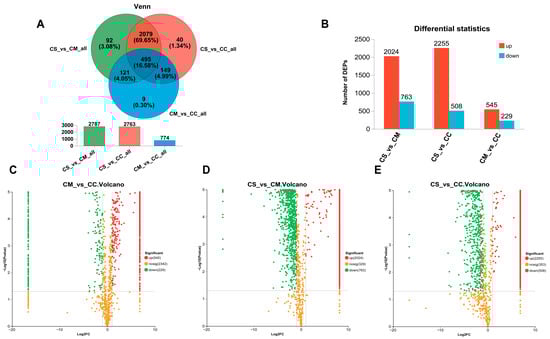 DEPs in different Cordyceps. (A) Venn diagram analysis of DEPs for CS, CM, and CC; (B) statistical analysis of DEPs; (C–E) volcano plot analysis of DEPs for CS, CM, and CC. The x-axis represents the log2-fold change in protein expression levels between the two samples, while the y-axis indicates the −log10-adjusted p-values reflecting the statistical significance of these differences. Each point on the plot corresponds to a specific protein. Proteins with downregulated expression are represented by points located on the left side of the plot, whereas those with upregulated expression are shown on the right.