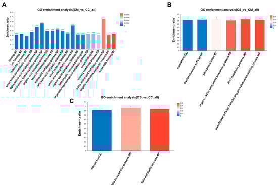 GO enrichment analysis of DEPs. (A) GO enrichment analysis of CM vs. CC; (B) GO enrichment analysis of CS vs. CM; (C) GO enrichment analysis of CS vs. CC. The x-axis represents the GO terms, while the y-axis represents the enrichment ratio. The column color gradient reflects the significance of enrichment. GO terms with p or FDR values < 0.001 are marked with “***”, those with p or FDR values < 0.01 are marked with “**”, and those with p or FDR values < 0.05 are marked with “*”.