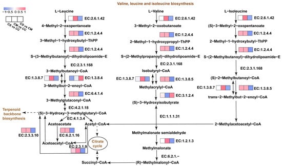 Based on the previous enrichment analysis of DEPs, we found that DEPs are significantly mainly involved in the amino acid biosynthesis and degradation of CS, CC, and CM. We further conducted KEGG discovery on the DEPs under the entries. Most of the DEPs are involved in the valine, leucine, and isoleucine degradation (Figure 6). Therefore, we analyzed the related pathways of the three species of Cordyceps. This pathway encompasses the degradation of branched-chain amino acids (BCAAs), including L-leucine, L-valine, and L-isoleucine. Through metabolic processes, it indirectly influences the tricarboxylic acid cycle and steroid skeleton synthesis. Specifically, EC: 2.6.1.42 (branched-chain-amino-acid aminotransferase, BCAT) catalyzes the conversion of L-leucine, L-valine, and L-isoleucine into 3-methyl-2-oxobutanoate and other corresponding 2-oxo acids. Notably, in the comparison of CM vs. CC, this enzyme is significantly upregulated compared to the other two groups, enhancing the availability of initial substrates and accelerating the entire biosynthetic pathway. Subsequently, EC: 1.2.4.4 (branched-chain keto acid dehydrogenase E1 subunit alpha, BCKDHA) catalyzes the oxidative decarboxylation of these 2-oxo acids to form their corresponding acyl-CoA derivatives. EC: 2.3.1.168 (branched-chain dihydrolipoamide acyltransferase, BCDAT), a component of the branched-chain keto acid dehydrogenase complex, further converts these α-keto acids into lipoamide thioester derivatives by transferring acyl groups to coenzyme A, generating acyl-CoA. These acyl-CoA derivatives are then subjected to β-oxidation via the actions of EC: 1.3.8.7 (medium-chain acyl-CoA dehydrogenase, ACADM) and EC: 1.3.8.5 (branched-chain acyl-CoA dehydrogenase, ACADSB), which catalyze the dehydrogenation step in fatty acid catabolism. Concurrently, EC: 3.1.2.4 (3-hydroxyisobutyryl-CoA hydrolase, HIBCH) converts 3-hydroxyisobutyryl-CoA into methylacrylyl-CoA. Through a series of enzymatic reactions, 2-methylacetoacetyl-CoA is converted into acetyl-CoA and participates in the tricarboxylic acid cycle. For L-isoleucine, its catabolic pathway follows similar steps and involves EC: 2.3.1.9 (acetyl-CoA acetyltransferase, ACAT) in downstream processing. These pathways are intricately linked to the TCA cycle via acetyl-CoA and succinyl-CoA, and they intersect with steroid skeleton biosynthesis through shared metabolic intermediates.