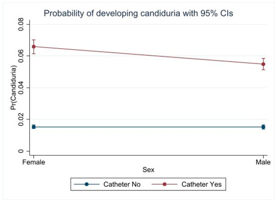 Regarding the variables that were ultimately included in the multivariable logistic regression model, a significant interaction was observed between sex and the presence of a catheter. Among patients without a catheter, there were no significant differences between men and women regarding the odds of having Candida spp. (adjusted OR: 1.00; 95% CI: 0.89–1.12; p = 0.99). However, among patients with a catheter, men had a lower probability of Candida spp. infection compared to women with a catheter (adjusted OR: 0.82; 95% CI: 0.74–0.90; p < 0.001). Additionally, catheter use was strongly associated with Candida spp. infection in both sexes. Compared to patients without a catheter, the odds were significantly higher in women (OR: 4.61; 95% CI: 4.15–5.12; p < 0.001) and men (OR: 3.78; 95% CI: 3.38–4.22; p < 0.001) (Figure 1).