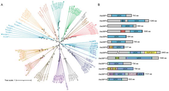 Saccharomyces cerevisiae contains 16 identified UBPs [37,56]. Using S. cerevisiae UBP protein sequences as queries, we identified 13 homologous proteins in the A. alternata tangerine pathotype strain Z7 genome (GenBank: GCA_014751505.1). These proteins were designated as AaUBP1~16, with AaUBP5, AaUBP10, and AaUBP11 absent from the genome. To analyze the evolutionary relationships among fungal UBPs, we performed multiple sequence alignment of UBP proteins from eight species: S. cerevisiae, Cryptococcus neoformans, Neurospora crassa, Aspergillus nidulans, M. oryzae, F. graminearum, Botrytis cinerea, and the A. alternata tangerine pathotype. Maximum likelihood phylogenetic analysis with IQ-TREE revealed that AaUBPs clustered with their respective homologs from other species (Figure 1A), suggesting functional conservation across fungi. InterPro domain analysis (https://www.ebi.ac.uk/interpro/search) revealed that all 13 AaUBPs contain the characteristic UCH domain, which is essential for recognizing and cleaving C-terminal glycine bonds in ubiquitin during precursor processing and protein deubiquitylation [34]. Several UBPs possessed additional functional domains: RHOD (AaUBP4), zf-UBP (AaUBP8 and AaUBP14), DUSP (AaUBP7, AaUBP9, and AaUBP12), DUF3517 (AaUBP9), and both MATH and USP7_ICP0_bdg (AaUBP15) (Figure 1B).