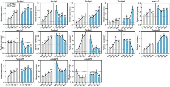 Comparative expression dynamics of Aaubp genes during PDA cultivation and leaf infection. Mycelium of wild-type strain Z7 was cultured in PDA medium or inoculated onto Hongjv leaves. Data are presented as means ± SE. Different letters indicate significant differences by Tukey’s test at p < 0.05.
