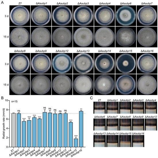 Growth characteristics of ΔAaubp mutants. (A) Colony morphology of wild-type strain (Z7) and ΔAaubp mutants grown on 6 cm PDA plates at 26 °C for 3 and 15 days. (B) Radial growth rates of colonies. Data are presented as means ± SE. Statistical significance was determined by Student’s t-test compared to wild-type Z7 (ns, not significant; ** p < 0.01; *** p < 0.001). (C) Hyphal coloration after 7 days of cultivation on PDA medium.