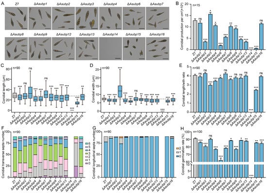 Conidia play a critical role in the disease cycle of citrus Alternaria brown spot. Among the thirteen ΔAaubp mutants, ΔAaubp14 exhibited complete loss of sporulation capacity, ten exhibited reduced sporulation, while ΔAaubp3 showed enhanced sporulation. Compared to wild-type Z7, severe sporulation defect (>50% reduction) was observed in ΔAaubp2, ΔAaubp6, ΔAaubp7, ΔAaubp12, ΔAaubp13, and ΔAaubp15. The ΔAaubp9 mutant showed moderate reduction (25–50%), while ΔAaubp4 and ΔAaubp8 exhibited mild reduction (<25%) in spore production (Figure 4A,B). In addition, we found that most Aaubp deletions significantly reduced conidial length, with the exception of ΔAaubp2, ΔAaubp3, and ΔAaubp7 (Figure 4C). Most ΔAaubp mutants also displayed reduced conidial width, whereas ΔAaubp3 deletion resulted in increased width and no significant changes in ΔAaubp7 (Figure 4D). Analysis of conidial length-to-width ratios revealed reductions in ΔAaubp3, ΔAaubp4, ΔAaubp6, ΔAaubp8, and ΔAaubp15 (Figure 4E). Moreover, several mutants exhibited reduced transverse septation, with ΔAaubp6 and ΔAaubp15 showing the most pronounced decrease (Figure 4F), and longitudinal septation was absent in ΔAaubp6, ΔAaubp7, ΔAaubp12, ΔAaubp13, and ΔAaubp15 conidia after 15 days of incubation on V8 medium (Figure 4G). These findings suggest that Aaubp genes are essential for proper conidial morphology. Conidial germination was impaired in all Aaubp mutants except ΔAaubp3. While Z7 showed 91.22% germination after 12 h incubation in 2% glucose at 26 °C, germination rates of ΔAaubp4, ΔAaubp6, ΔAaubp7, and ΔAaubp9 fell below 80%, with ΔAaubp6 showing the lowest germination rate of 62.33% (Figure 4H), demonstrating the importance of Aaubp genes in conidial germination.