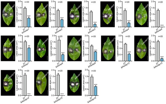 Pathogenicity analysis of ΔAaubp mutants. Mycelial plugs (3-mm diameter) were inoculated onto Hongjv citrus leaves and incubated at 26 °C with 100% humidity. Disease symptoms were evaluated at 72 hpi. Lesion areas were measured using ImageJ software (1.54d). Scale bar = 1 cm. Data are presented as means ± SE. Statistical significance was determined by Student’s t-test compared to wild-type Z7 (** p < 0.01; *** p < 0.001).