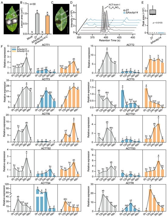 Aaubp14 regulates ACT-toxin biosynthesis. (A) Pathogenicity assay of wild-type Z7, ΔAaubp14 mutant, and complemented strain ΔAaubp14-C on Hongjv leaves. Mycelial plugs (3 mm in diameter) were inoculated and incubated at 26 °C for 72 h. (B) Quantification of lesion areas at 72 hpi using ImageJ software (1.54d). (C) Virulence assay on Hongjv leaves using crude toxin extracts from Z7 and ΔAaubp14, assessed at 36 hpi. (D) UHPLC-MS/MS detection of ACT-toxin I in Z7 and ΔAaubp14. (E) Quantitative comparison of ACT-toxin I levels between Z7 and ΔAaubp14 strains by UHPLC-MS/MS. Peak areas were normalized based on the dry weight ratio of Z7 to ΔAaubp14 mycelial biomass. (F) Expression analysis of ACTT genes in Z7, ΔAaubp14, and ΔAaubp14-C strains after Hongjv leaf inoculation by qRT-PCR. Different letters indicate significant differences by Tukey’s test at p < 0.05.