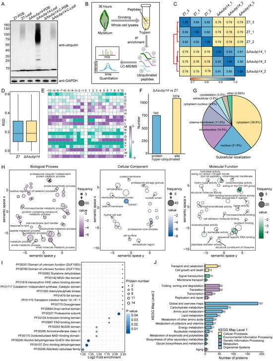 Global ubiquitinome analysis of ΔAaubp14 during infection. (A) Western blot analysis of total protein ubiquitination in wild-type and ΔAaubp14 mutant. (B) Workflow of quantitative ubiquitinome analysis. Mycelium from wild-type and ΔAaubp14 strains was inoculated onto Hongjv leaves (26 °C, 36 h), followed by protein extraction, trypsin digestion, ubiquitin peptide enrichment, and LC-MS/MS analysis. (C) Pearson correlation analysis of biological replicates shown as a heatmap. Darker blue shades reflect stronger correlations approaching 1. (D) Relative standard deviation (RSD) distribution of quantified proteins. Smaller RSD values indicate better quantitative reproducibility. (E) Amino acid frequency analysis of ubiquitination sites. (F) Distribution of hyper-ubiquitinated proteins and modification sites identified in ΔAaubp14. (G) Subcellular distribution of hyper-ubiquitinated proteins. (H) GO enrichment analysis of biological processes. (I) Enriched protein domains among hyper-ubiquitinated proteins. (J) KEGG pathway enrichment analysis of hyper-ubiquitinated proteins.