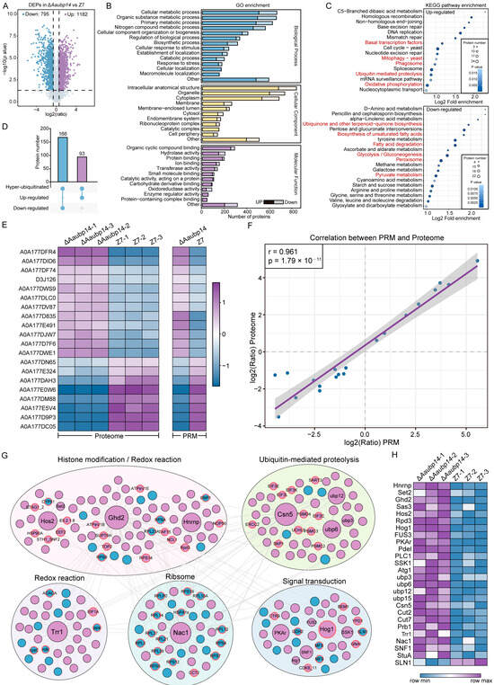 Comparative proteomic analysis reveals Aaubp14-mediated regulation of pathogenicity-related proteins. (A) Volcano plot analysis of DEPs between wild-type (Z7) and ΔAaubp14 mutant. Blue: downregulated DEPs; purple: upregulated DEPs; gray: non-differentially expressed proteins. (B) GO terms of DEPs between Z7 and ΔAaubp14. (C) KEGG pathway enrichment analysis of DEPs between Z7 and ΔAaubp14. (D) Upset plot showing the overlap between DEPs in ΔAaubp14 and Z7 and hyper-ubiquitinated proteins in ΔAaubp14. Blue dots indicate sets participating in each intersection, gray dots represent sets not involved in the specific intersection. Dot size reflects intersection size. (E) Heatmap comparing proteomic and SLN results of randomly selected 20 DEPs in ΔAaubp14 and Z7. (F) Scatter plot depicting the correlation of DEPs abundance ratios between proteomic and PRM analyses. The blue dots represent individual data points of DEPs. The purple regression line and shaded confidence interval highlight the linear relationship. (G) Protein–protein interaction network of DEPs related to virulence. Red circles indicate hyper-ubiquitinated in ΔAaubp14. (H) Expression profiles of known pathogenicity-related proteins in Z7 and ΔAaubp14.