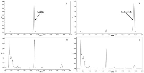 HPLC chromatograms of MK from transformed and original strains of M. pilosus. (A) Acidic form of MK standard; (B) lactone form of MK standard; (C) sample from transformed strain of M. pilosus; (D) sample from original strain of M. pilosus.