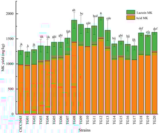 HPLC chromatograms (Figure 1) illustrated the MK profiles of the transformed strains and the original strain. As shown in Figure 2, 13 of the transformed strains (TG05, TG06, TG07, TG08, TG09, TG10, TG11, TG12, TG13, TG15, TG18, TG19, TG20) exhibited significantly higher MK production compared to the original strain, with the highest increase observed in TG12 (52.5%), followed by TG08 (47.51%). The other seven transformants showed no significant differences in MK production compared to the original strain.