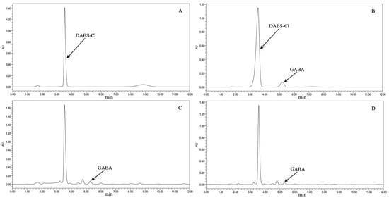 HPLC chromatograms of GABA from transformed and original strains of M. pilosus. (A) Derivatization reagent DABS-Cl solution; (B) GABA standard; (C) sample from transformed strain of M. pilosus; (D) sample from original strain of M. pilosus.