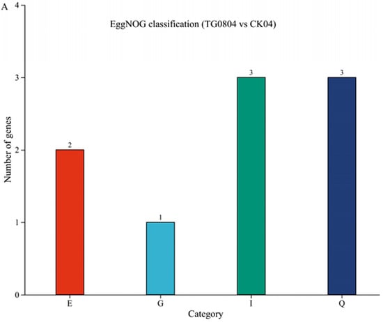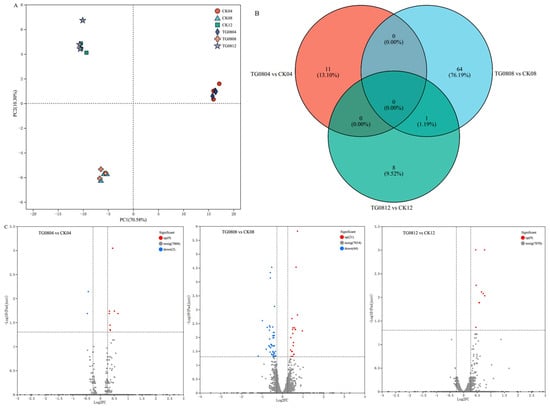VIP value analysis of differential metabolites is displayed in Figure 9D–F. For TG0804 vs. CK04, 12 metabolites were upregulated and 18 downregulated. In TG0808 vs. CK08, 18 metabolites were upregulated and 12 downregulated. In TG0812 vs. CK12, 1 metabolite was upregulated, while 29 were downregulated.