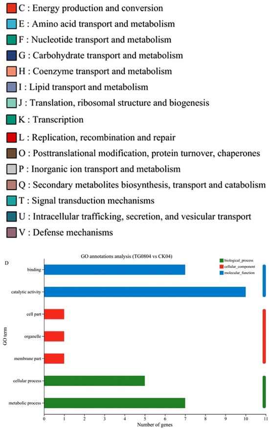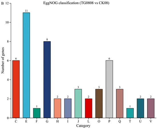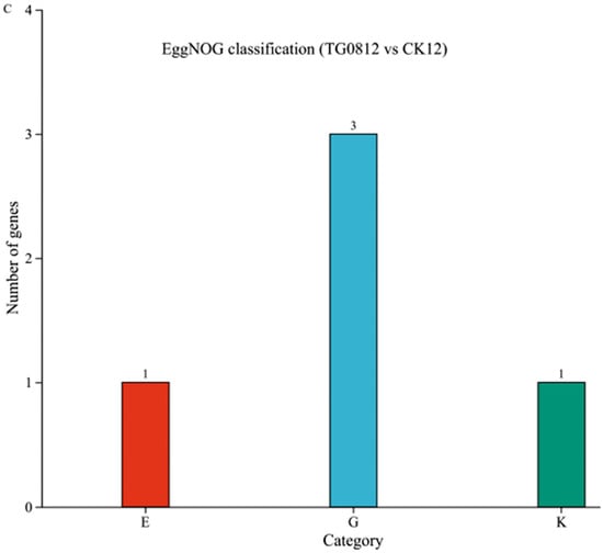 A Venn diagram (Figure 5B) identified 65 differentially expressed genes (DEGs) in TG0808 vs. CK08, 11 in TG0804 vs. CK04, and 9 in TG0812 vs. CK12. Volcano plots (Figure 5C) illustrated upregulated and downregulated genes at different fermentation times. In TG0804 vs. CK04, 9 genes were upregulated and 2 downregulated; TG0808 vs. CK08 showed 21 upregulated and 44 downregulated genes; and TG0812 vs. CK12 exhibited 9 upregulated genes with no downregulated genes.