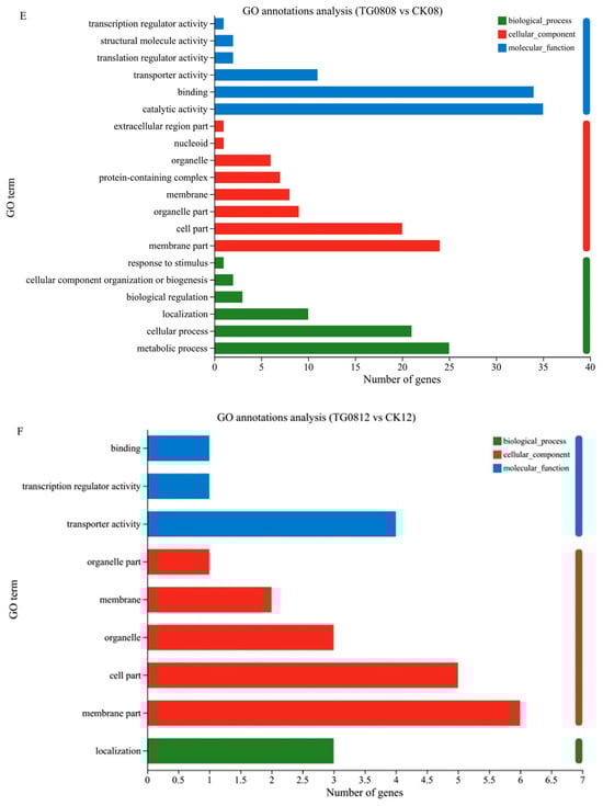 GO enrichment analysis (Figure 7A,B) highlighted significant pathways (p-value < 0.05) in TG08 vs. CK. The DEGs in TG0804 vs. CK04 were related to carboxylic acid metabolic process, oxoacid metabolic process, cellular catabolic process, α-amino acid metabolic process, catabolic process, organic substance catabolic process, aromatic amino acid family metabolic process, organonitrogen compound catabolic process, aromatic amino acid family catabolic process, cellular amino acid catabolic process, small molecule catabolic process, α-amino acid catabolic process, tyrosine metabolic process, erythrose 4-phosphate/phosphoenolpyruvate family amino acid catabolic process, L-phenylalanine metabolic process, carboxylic acid catabolic process, organic acid catabolic process, L-phenylalanine catabolic process, erythrose 4-phosphate/phosphoenolpyruvate family amino acid catabolic process, and tyrosine catabolic process (Figure 7A). The DEGs in TG0808 vs. CK08 were associated with organic acid biosynthetic process and carboxylic acid biosynthetic process (Figure 7B). No significant GO enrichment was observed for TG0812 vs. CK12 (p-value < 0.05).