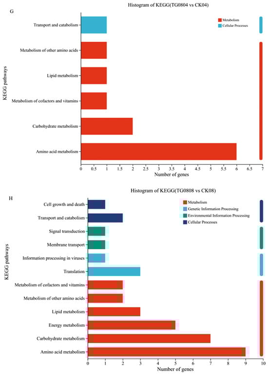 KEGG enrichment analysis (Figure 7C,D) highlighted significant KEGG pathways (p-value < 0.05) in TG08 vs. CK. The DEGs in TG0804 vs. CK04 were related to tyrosine metabolism, valine, leucine and isoleucine degradation, phenylalanine metabolism, and α-linolenic acid metabolism (Figure 7C). The DEGs in TG0812 vs. CK12 were associated with meiosis–yeast pathway (Figure 7D). No significant KEGG enrichment was noted for TG0808 vs. CK08 (p-value < 0.05).