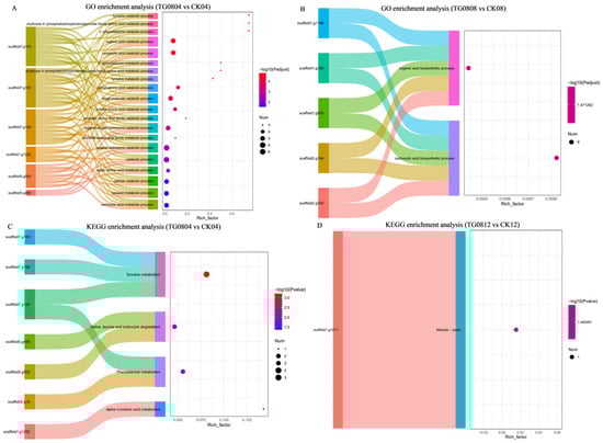 Sankey and bubble diagrams for GO and KEGG enrichment analysis of differentially expressed genes in mycelium samples from different groups. (A,B) GO enrichment; (C,D) KEGG enrichment. (A) TG0804 vs. CK04; (B) TG0808 vs. CK08; (C) TG0804 vs. CK04; (D) TG0812 vs. CK12. The bubble charts show the top 20 enriched pathways, and the Sankey diagrams highlight the top 5 differential genes sorted by p-value.