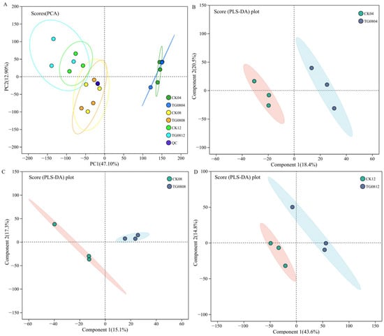 PCA and OPLS-DA analysis of metabolites in MFB samples. (A) PCA score plot; (B–D) OPLS-DA score plots for TG0804 vs. CK04, TG0808 vs. CK08, and TG0812 vs. CK12, respectively.