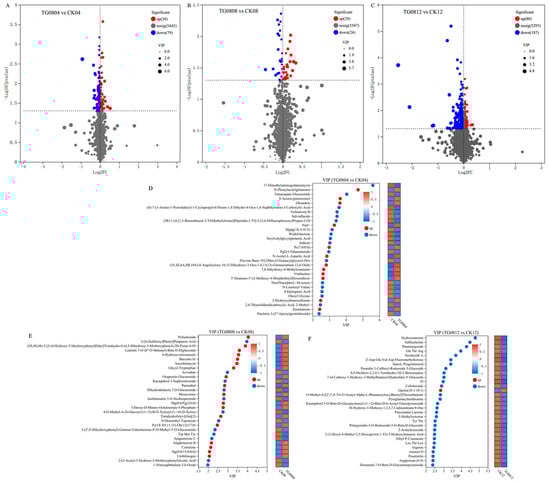Volcano plots and VIP value analysis of differential metabolites in MFB samples. (A–C) Volcano plots; (D–F) VIP value analysis charts. (A,D) TG0804 vs. CK04; (B,E) TG0808 vs. CK08; (C,F) TG0812 vs. CK12. The VIP charts display the top 30 metabolites, sorted by VIP value. Red indicates upregulated metabolites, and blue indicates downregulated metabolites.
