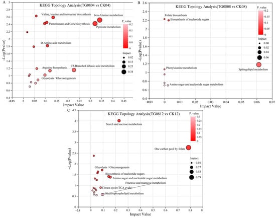 KEGG topological analysis bubble charts of differential metabolites in MFB. (A) TG0804 vs. CK04; (B) TG0808 vs. CK08; (C) TG0812 vs. CK12. Bubble charts highlight the top 5–8 enriched pathways based on impact value and p-value.