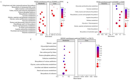 KEGG pathway enrichment analysis from combined transcriptomic and metabolomic data (Figure 11) revealed that in TG0804 vs. CK04, differential genes and metabolites were jointly enriched in pathways such as tyrosine metabolism, phenylalanine metabolism, pentose phosphate pathway, propanoate metabolism, and β-alanine metabolism. No common enriched pathways were identified for TG0808 vs. CK08 and TG0812 vs. CK12.