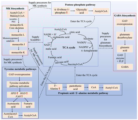 In summary, the overexpression of the GAD gene may promote the redirection of metabolic flux in Monascus pilosus and enhance its MK and GABA synthesis levels by regulating key metabolites and genes in pathways such as tyrosine metabolism, the pentose phosphate pathway, and β-alanine metabolism. This is achieved through mechanisms including enhanced TCA cycling, increased acetyl-CoA supply, and optimized energy metabolism. The proposed metabolic regulation network is illustrated in Figure 12.