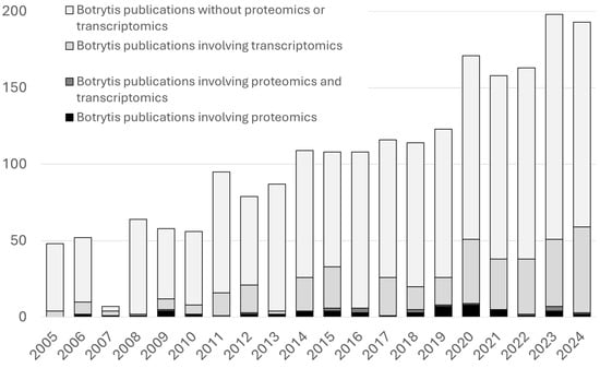 Number of Botrytis cinerea publications in PuMed in the last 20 years involving transcriptomics, proteomics, both, or none.